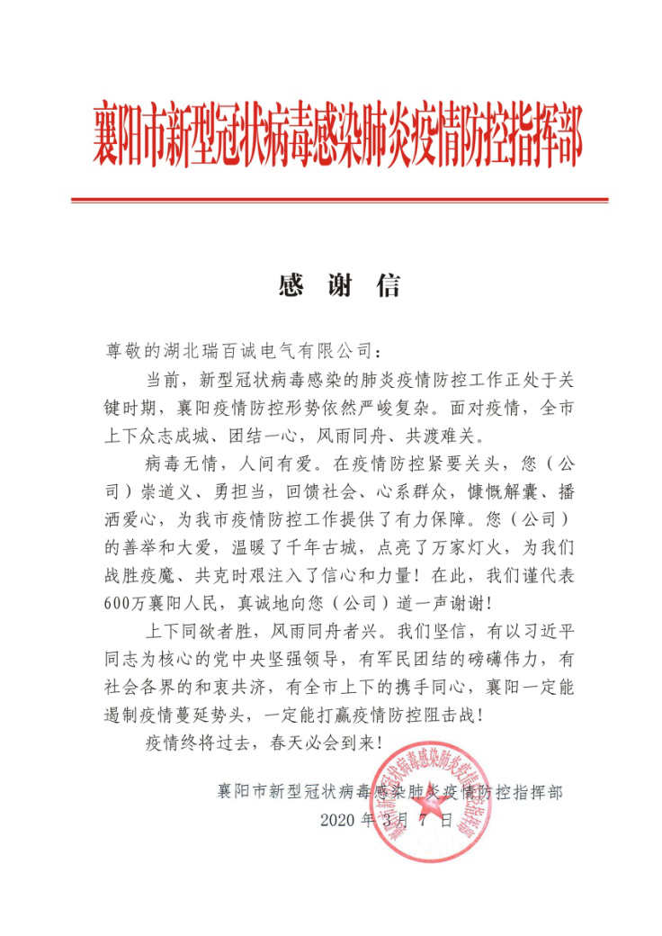 最后,湖北瑞百誠電氣有限公司向所有戰斗在一線的工作者致敬!您們辛苦了!